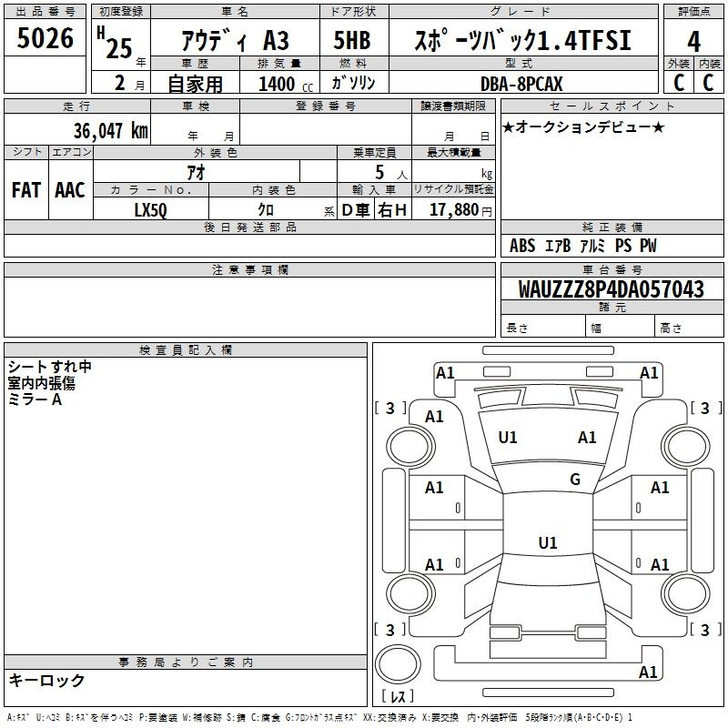Аукцион: TAA Yokohama, лот: 5026: торги 10.05.2025 г AUDI A3 Sports Back 1.4TFSI, оценка "4", правый руль, пробег 37000 км, автомат, передний привод. Стартовая цена: 10000 иен. Примерная цена на аукционе: 385 000 иен. Расшифровка аукционного листа бесплатно. ✔️ Стоимость (для личного использования), фрахт из Японии, комиссии брокера, таможенные сборы, утилизационные сборы, склад СВХ и транспортировка в г. Санкт - Петербург. Стоимость под ключ: 1 120 000 рублей. ✅ Привезем, растаможим и доставим! Ленинградская область, г. Мурино, Шоссе в Лаврики, д. 33, офис 30Н, 📧1000bb@mail.ru, ☎️ +79808042362, @auto1000bb, сайт 1000bb.ru