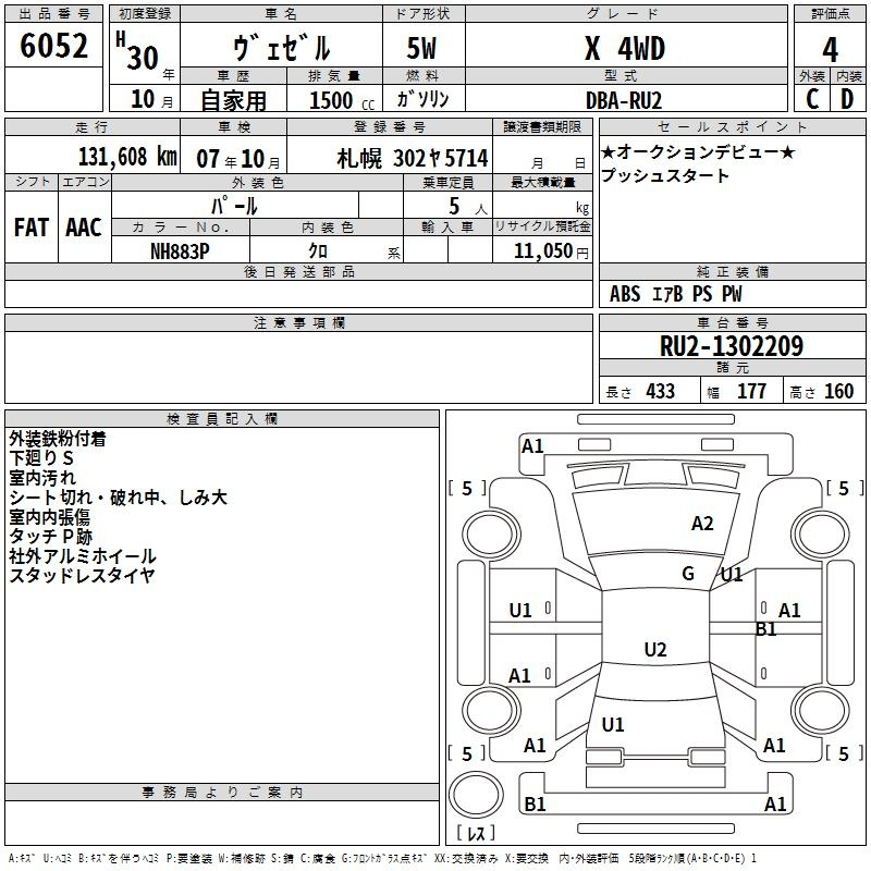 Аукцион:TAA Hokkaido, лот:#6052, торги 22.05.2025 г, HONDA VEZEL X 4WD 2018 года, оценка "4", правый руль, пробег 133000 км, автомат, полный привод. Стартовая цена: 1 000 иен. Примерная цена на аукционе: 1200 000 иен. Расшифровка аукционного листа бесплатно. ✔️ Стоимость (для личного использования), фрахт из Японии, комиссии брокера, таможенные сборы, утилизационные сборы, склад СВХ и транспортировка в г. Санкт - Петербург. Стоимость под ключ: 1 663 000 рублей. ✅ Привезем, растаможим и доставим! Ленинградская область, г. Мурино, Шоссе в Лаврики, д. 33, офис 30Н, 📧1000bb@mail.ru, ☎️ +79808042362, @auto1000bb, сайт 1000bb.ru